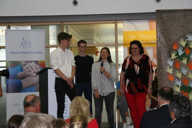 Die Stiftung der Passauer Neuen Presse hat das FairTrade-Team unseres Maria-Ward-Gymnasiums mit einem Geldpreis von 800 Euro ausgezeichnet. Im Rahmen des Wettbewerbs, an dem unter dem Motto „Von Mensch zu Mensch“ 20 Gymnasien teilnahmen, errang das soziale Engagement unserer Schülerinnen und Schüler einen beachtlichen vierten Platz. Herr Wolfgang Sellner, zweiter Bürgermeister von Altötting, lobte die aussagekräftige Präsentation der vier Säulen des FairTrade Engagements unserer Schule. Julia Brunner, Luca Aigner und Elias Blechta stellten die Unterrichtsideen, die meditativen Ergebnisse, den Bananentanz der FairTrade Tanzgruppe und das FairTrade Mobil vor. Unsere sechs Tänzerinnen Eva Herrmann, Maria Müller, Fiona Postberg, Helene Reiter, Lea Starnecker und Lea Korbl begeisterten mit ihrer Darbietung das Publikum im Atrium der Passauer Neuen Presse in Sperrwies. Auch konnten wir direkt vor Ort FairTrade Waren mit Unterstützung durch Frau Ulrike Prostmeier vom Weltladen Altötting verkaufen. Aus den Händen von Wissenschaftsminister Bernd Sibler nahmen Elias Blechta, Frau Lisa Sagerer und Frau Michaela Ingerl die Auszeichnung entgegen.